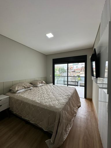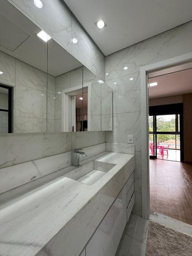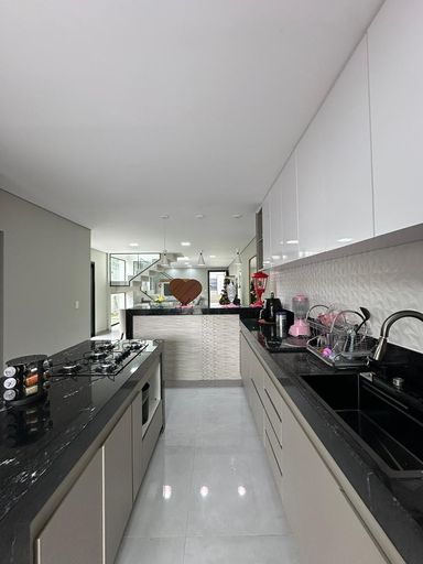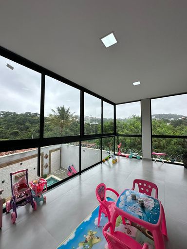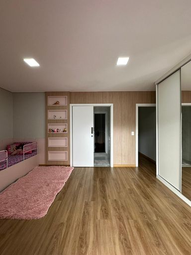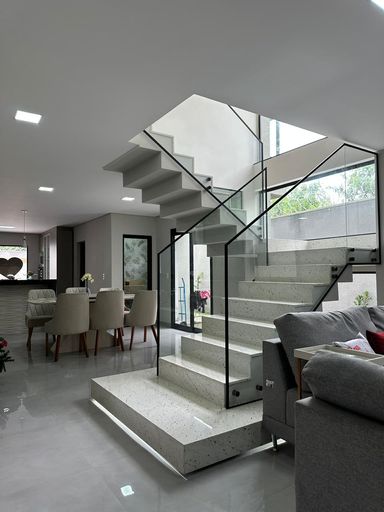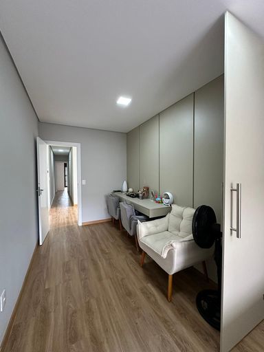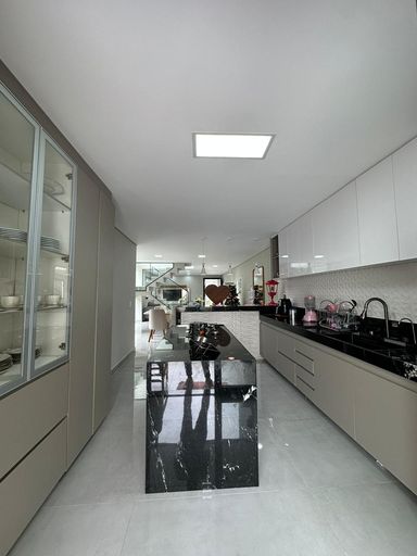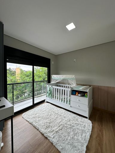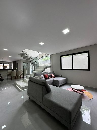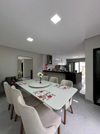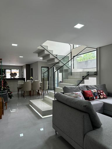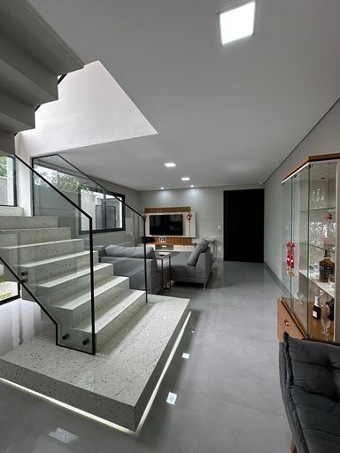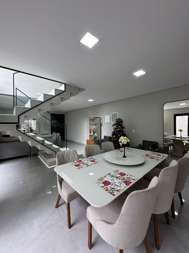 O imóvel dispõe de três quartos, sendo uma suíte e uma semi-suíte, garantindo praticidade e privacidade aos moradores. Conta com quatro vagas de garagem e infraestrutura preparada para ar-condicionado.